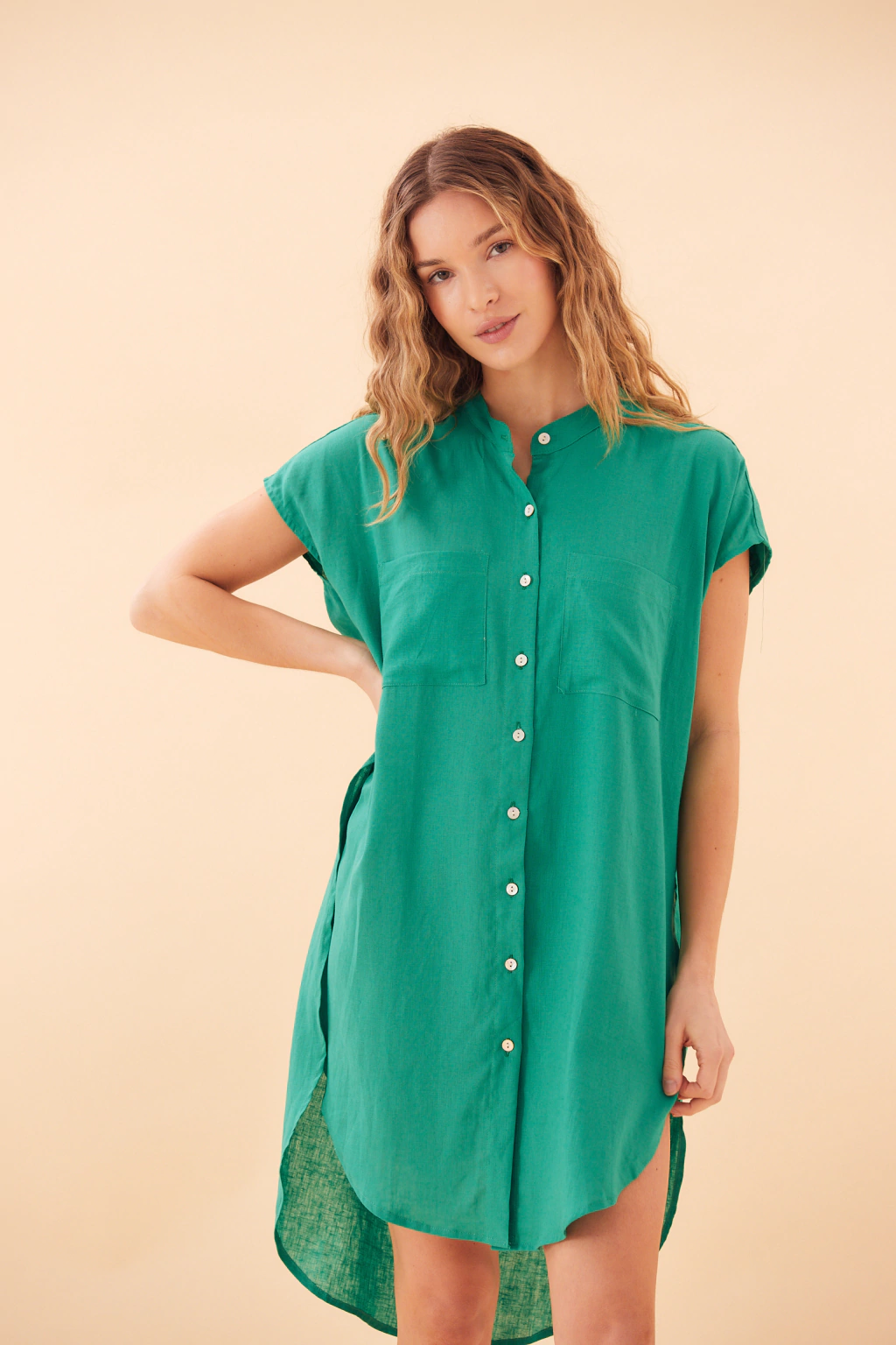 El detalle de bolsillo en el frente y los botones de nácar realzan su carácter elegante y natural, convirtiéndola en una prenda cómoda y atemporal para tu vestidor de verano.